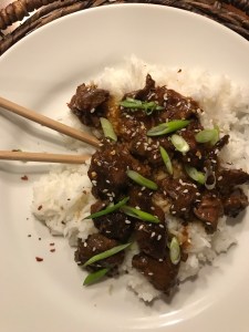 Here has a the recipe, but you can also access the original HERE. I made minor changes, first I use sirloin instead of flank steak. Second, I don’t put the green onions in with the meet – I only use them sprinkled on top when I serve it. And third, I use tapioca starch but that’s only because my hubby doesn’t do corn products. And finally, I sprinkle a few sesame seeds on top when I plate it. For everything else I follow he recipe. Enjoy!