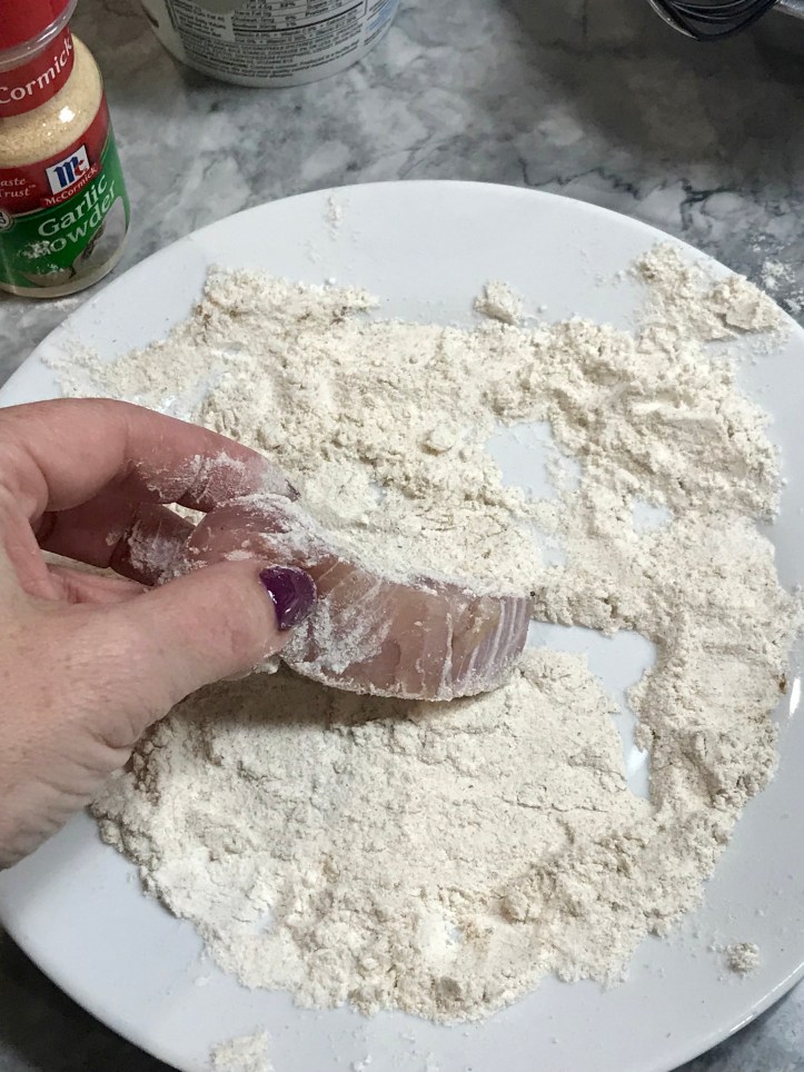 Rinse and pat the fish dry. Cut into strips across the fillet, approximately 1 inch wide by 3 inches long. Season the fish with salt and pepper and set aside. In a shallow dish, mix the GF flour, cumin and garlic powder gently with a fork. In a separate small dish, beat one egg. Coat each piece of fish in the flour mixture, then dip in the egg, then back in the flour mixture again. Set the fish aside.