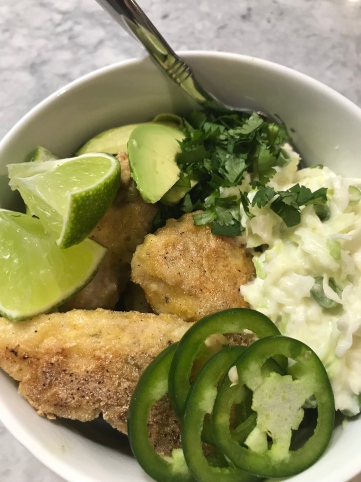 Heat the oil in a large skillet over high heat, place the fish pieces in the pan and cook 1-2 minutes on each side to form a crispy crust without over-cooking the fish. Remove from heat and assemble the bowls. Put the cooked rice in the bottom of the bowl, place the fish on top, along with the slaw, and any toppings you desire like avocado, guacamole, limes, jalapeños or salsa. Serve with a lime wedge and the remaining yogurt sauce drizzled on the fish.